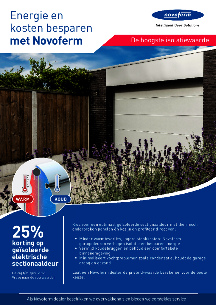Wilt u energie besparen én profiteren van een aantrekkelijke actie? Kies dan nu voor een geïsoleerde elektrische sectionaaldeur van Novoferm en ontvang 25 procent korting.